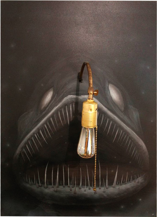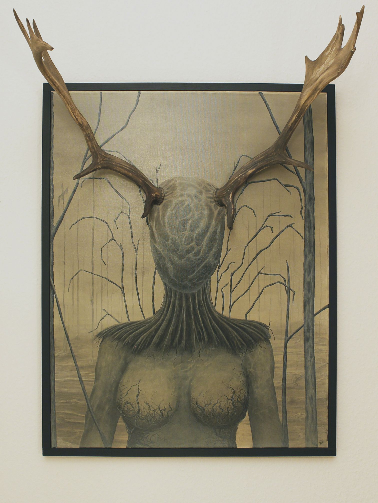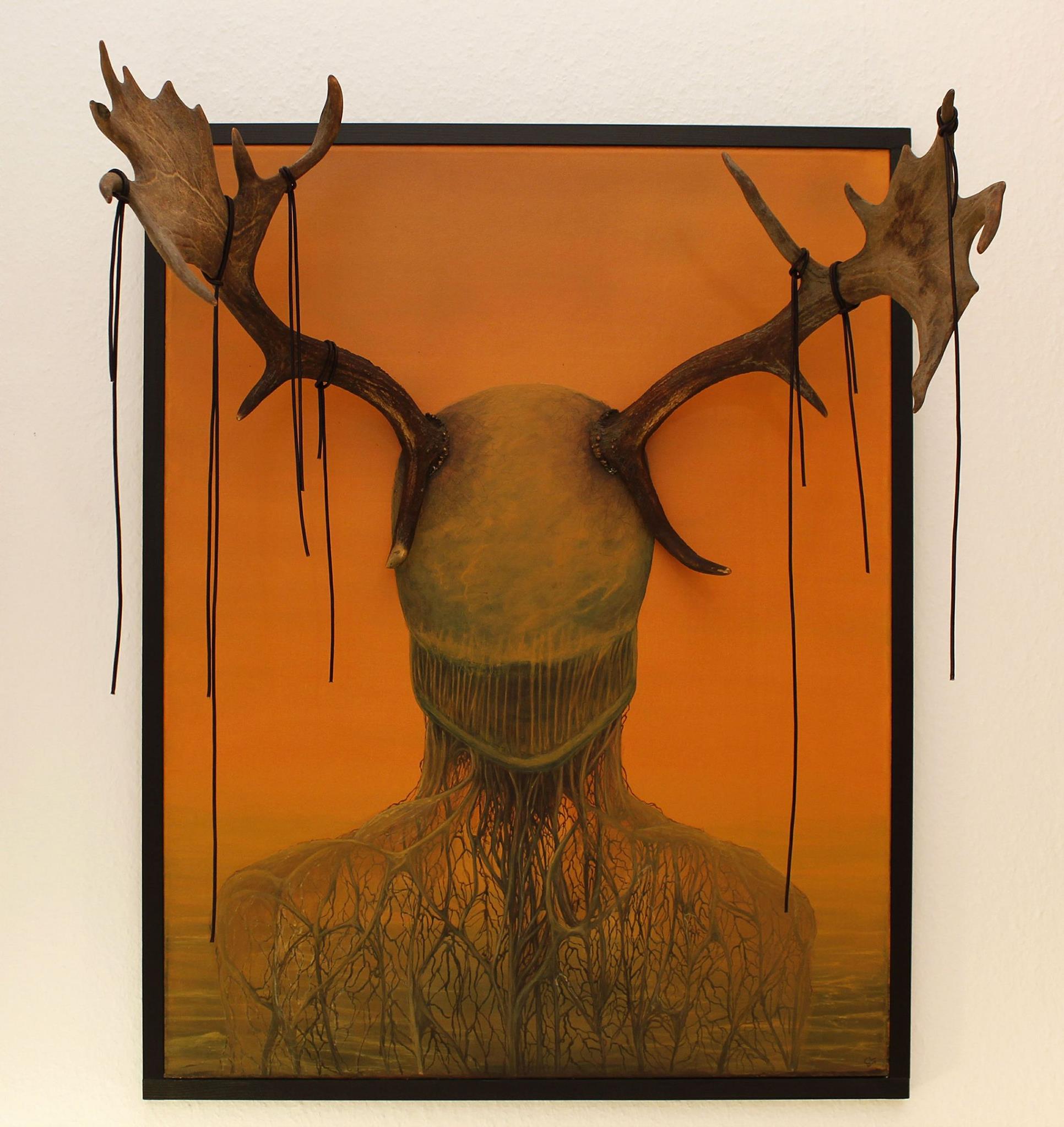 Untitled, 70cm×90cm Acrylic on Canvasboard, Deer Horns attached